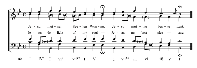 In the SATB Choral Music style of chordal construction, composers have to keep a few things in mind: the stem direction, range, spacing, voice crossing, and doubling. Here is an example of Johann Sebastien Bach's "Jesu meiner Seelen Wonne" in the style of Chorale.
