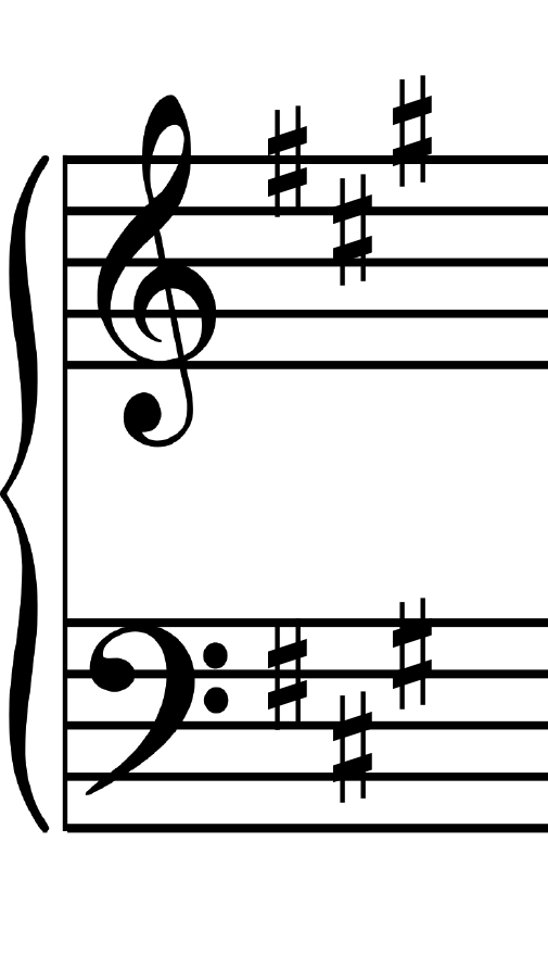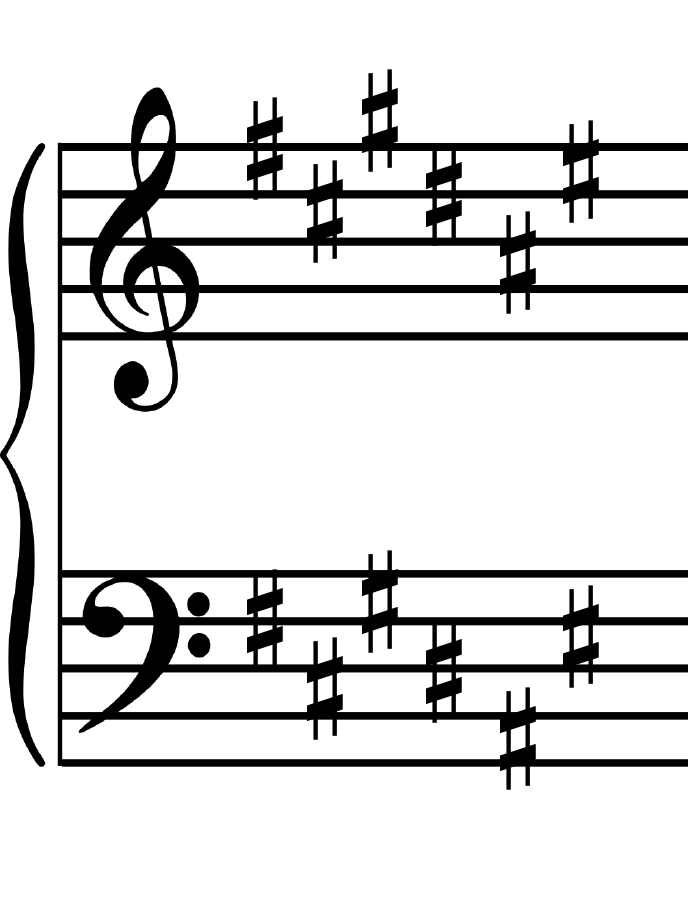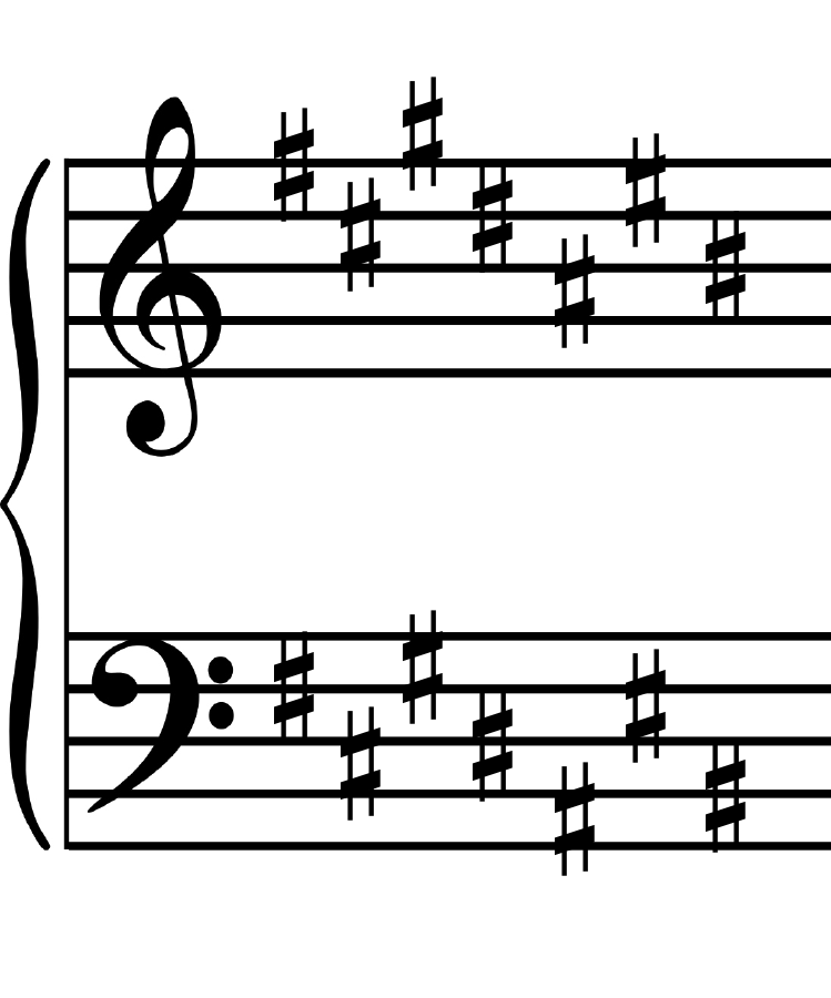 The music symbols between the Clef and the Time Signature is called the Key Signature. It indicates the Key, or Tonality, of the song. When a note requires a raised tone, a Sharp is used as an indication for the entire piece of music, when used as a Key Signature. See the sample below.