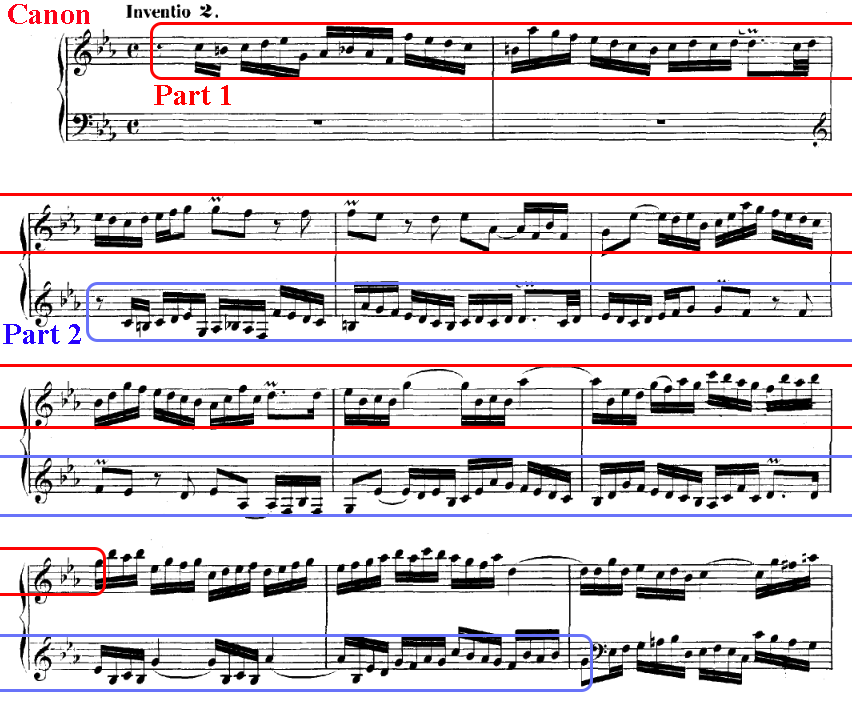 One of the two or more parts will be the leading part while the other part(s) will enter the music a little later and complete the whole musical idea just like the leading part, such as JS Bach's Invention No. 2 |