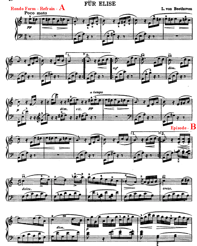 In a typical Rondo Form, the composer introduces a theme called "Refrain" that returns throughout the piece. Between recurring of the theme (Refrain), there are sections of contrasting music called "Episodes", which often occur in a different key from the original Refrain. A 5-part Rondo Form is written in sections of ABACA, and a less frequently used 7-part Rondo Form is written with ABACABA sections. However, the 7-Part Rondo has more variations. See here. The most famous example of a Rondo Form music is probably "Für Elise" by Ludwig Van Beethoven. It is structured in the 5-Part ABACA Rondo Form. The Refrain was written in A Minor and followed by an Episode B in F Major and an Episode C in A Minor.