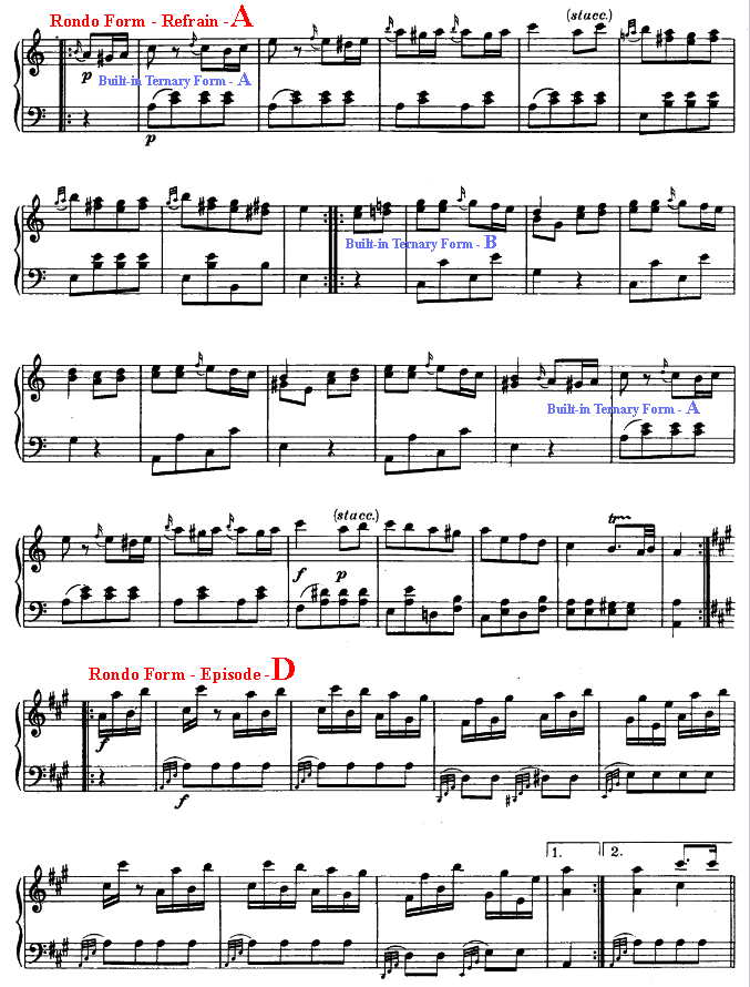 Another very famous Rondo, but different, written by Wolfgang Amadeus Mozart in seven sections, ABCBADE, with built-in Ternary (ABA) Forms in the two Refrains and Episode C. The following example is from Mozart's Piano Sonata No.11, Last Movement. It is called the "Turkish March."