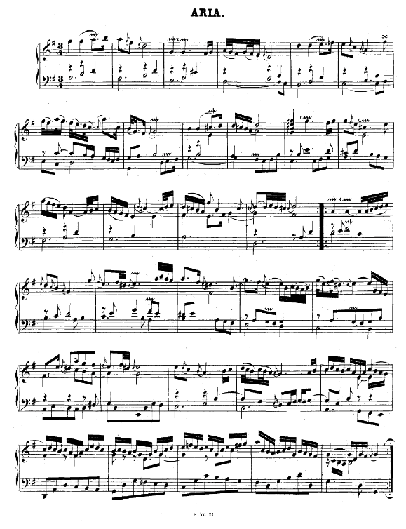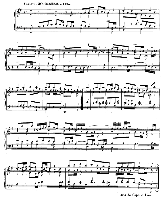 The final Variation, no.30, was labeled "Quodlibet." A Quodlibet is a musical composition that combines several different melodies—usually popular tunes—in counterpoint, and often in a light-hearted, humorous manner. Then, at the end of this piece, Bach wrote, "Aria da capo e Fine" for players to know to return back to the Theme (Aria) as the final section of this huge piece of music called "Goldberg Variations."