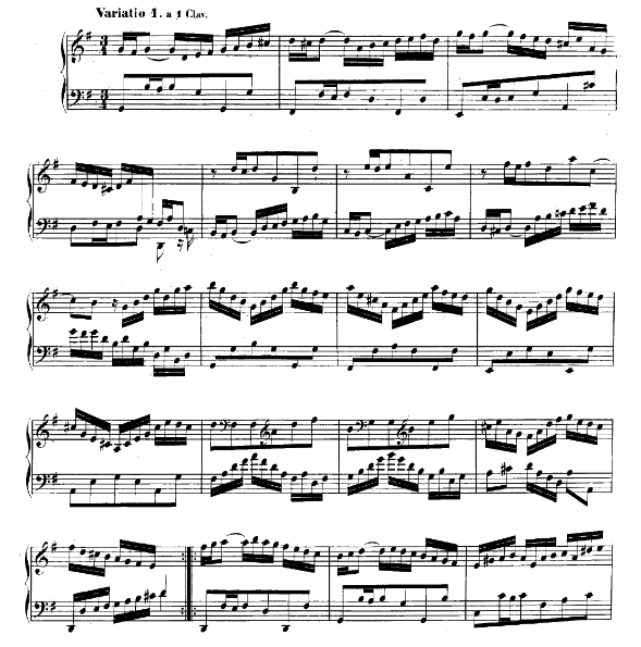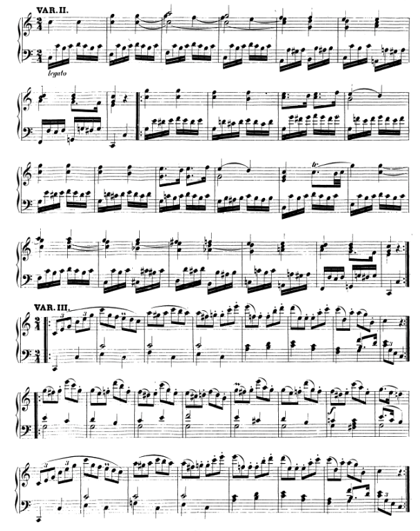 Variation 1 changes to a speedy scale and arpeggio runs throughout the piece. Like the Theme, it has two sections and both are repeated, while the first section lands on a Dominant chord and the ending stands on a Tonic chord.