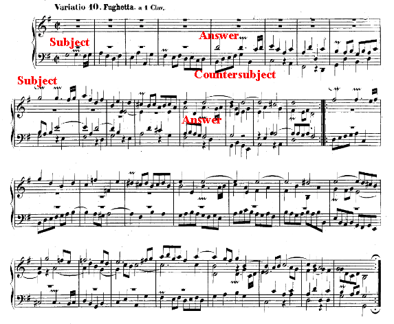 The "Little Fugue" in Variation 10 has all the elements of a 4-voices authentic Fugue.