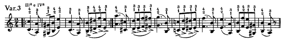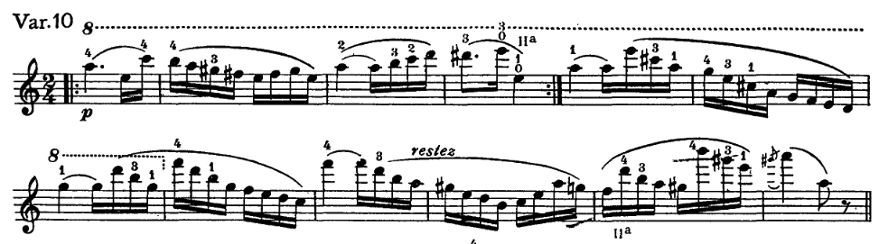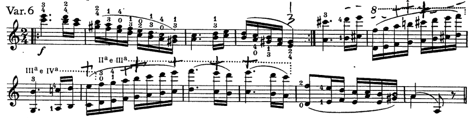 Variation 6 involves more double-stops in the intervals of thirds and tenths, including harmonics, meaning light touches on the strings without pressing down onto the finger board.