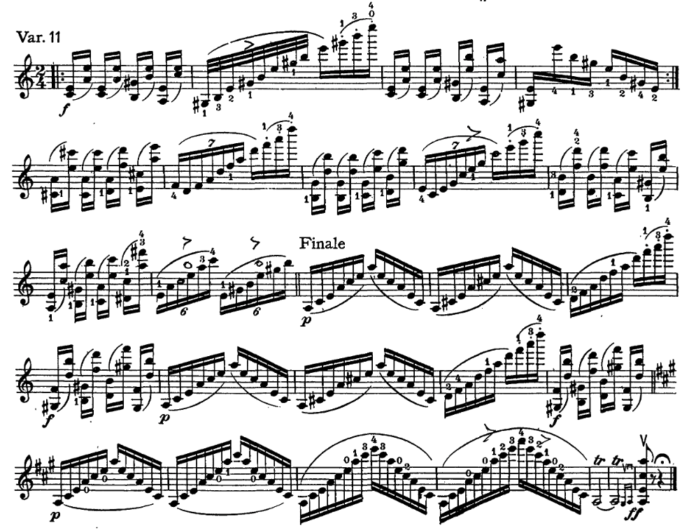 When this Caprice starts with a tempo mark of "Quasi Presto", players understand that it is a very fast moving music. However, there are 32nd notes in Variation 11 and shifting double-stops in between. Finally, the Finale section culminates with more arpeggios and double-stops before the music modulates to A Major for the last seven measures, including a low trill. Wow!