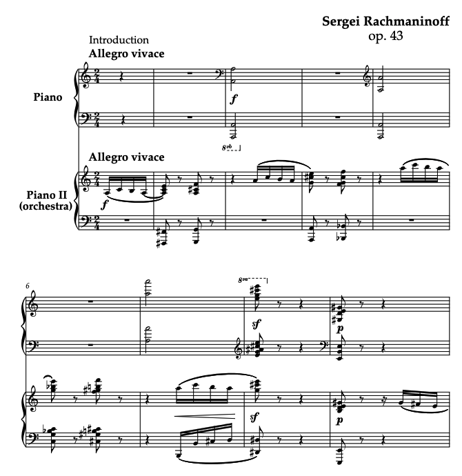 Many composers have written music with the Theme & Variations form by using the Paganini's Theme above. Sergei Rachmaninoff took that melody from Niccolo Paganini's Violin Caprice as the Theme and wrote "Rhapsody on a Theme of Paganini" with 24 Variations. Many different tempos can be found in this composition, such as Allegro Vivace, Più vivo, Meno mosso, a tempo moderato, Moderato, a capriccio, Tempo di Minuetto, Scherzando, Allegretto, Andante cantabile, and more. Rachmaninoff used different Time Signatures as well, from the original 2/4, 3/4, to 12/8. The following examples are taken from a two-piano score and a reduction of the orchestral score.