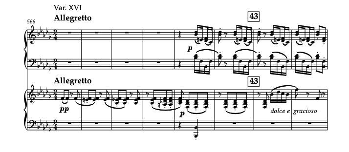 Variation 17 continues with the dark and moody characters, but a new Time Signature, "C" for Common Time and (12/8) as an alternate when the subdivision of the beats are changed.