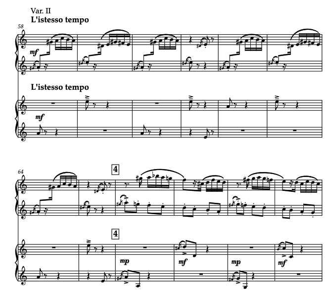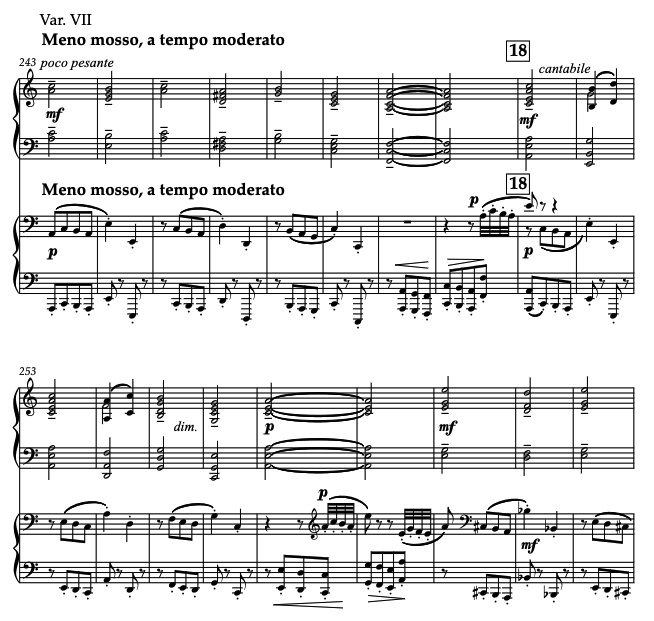 A chordal structure in the solo piano part gives the player a little rest from a very busy and fancy Variation 6.