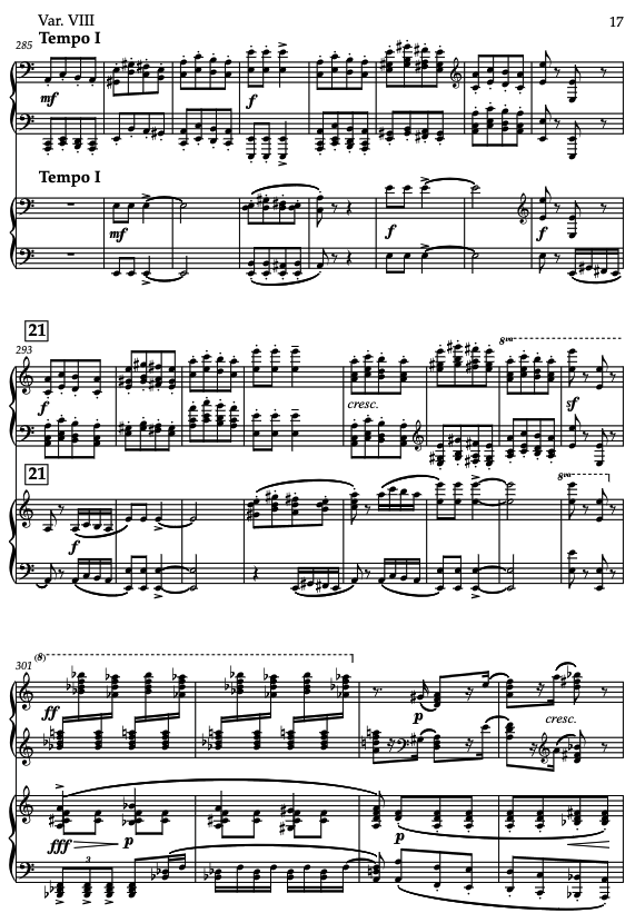 When an octave sign is used above multiple high ledger lines, like in Variation 10 here, the music has very high pitches. The perfect pitches could only be created by moving the fingers ever so slightly.