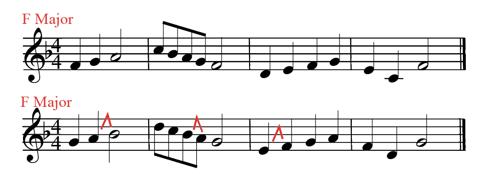 A Diatonic Transposition is transposition made within a diatonic scale (the most common kind of scale, indicated by one of a few standard key signatures). For example, the same F Major pattern used above is here once again. However, with the Diatonic Transposition, the places of half steps, or intervals of a minor seconds, have shifted, and the melody no longer stayed in the same fashion as if it were transposed into G Major. The three red marks are showing the positions of the new half steps, or intervals of a minor seconds.