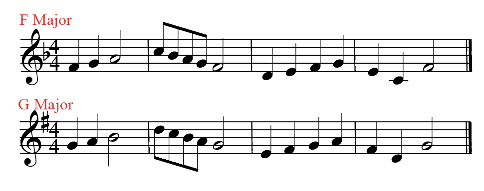 Transposition in music means to move or shift from one key, or tonal center, to another. The shifting of a melodic and/or harmonic progression, a section of a song, or an entire musical piece to another key, while maintaining the same tone structure, including all the whole steps, half steps, and other intervals, it is called a Chromatic Transposition. See the sample below for an F Major melody that is transposed into G Major. All the pitches, intervals, and rhythm remain the same.