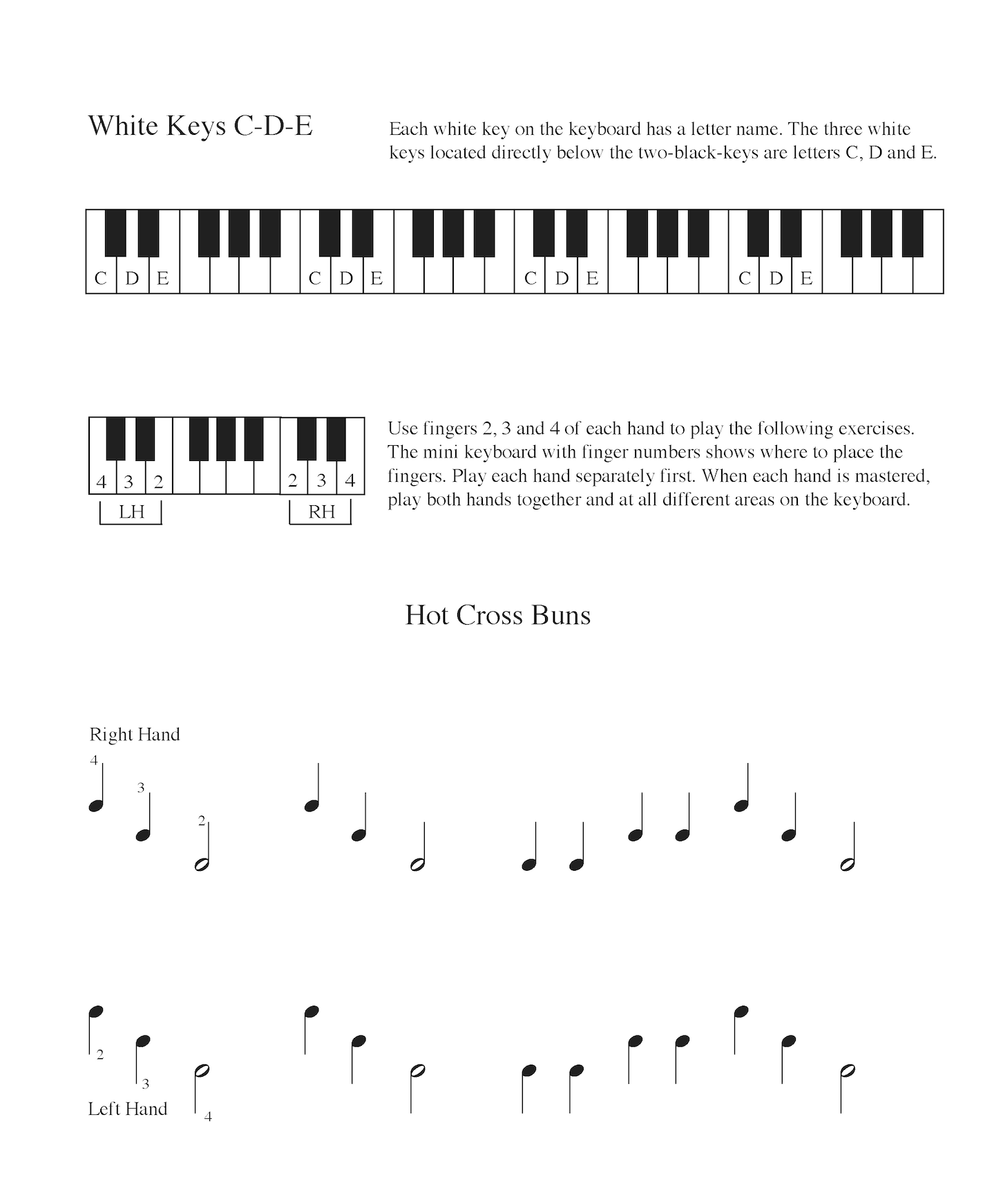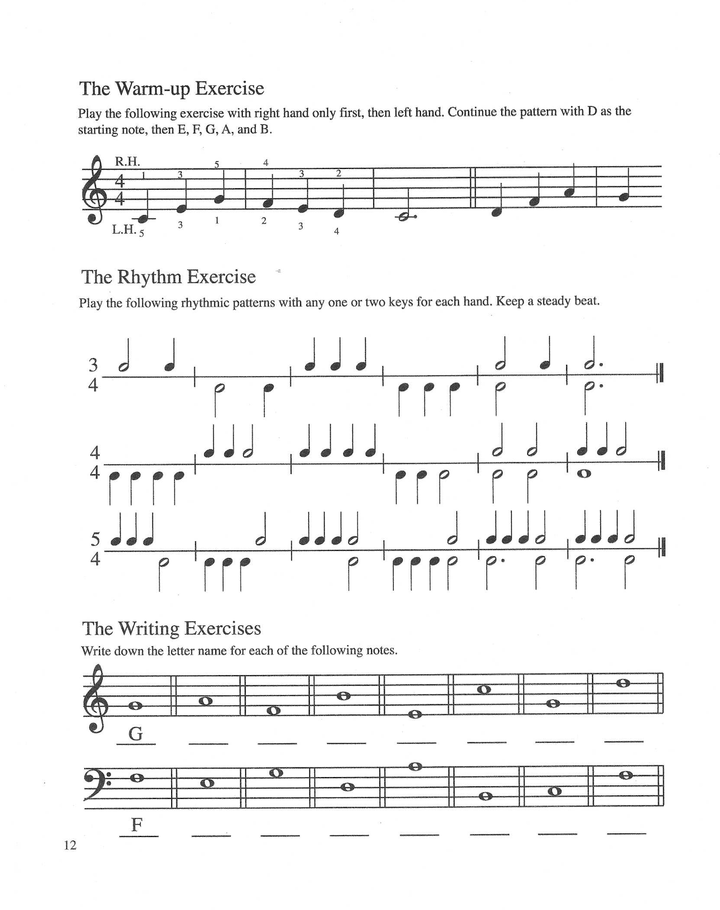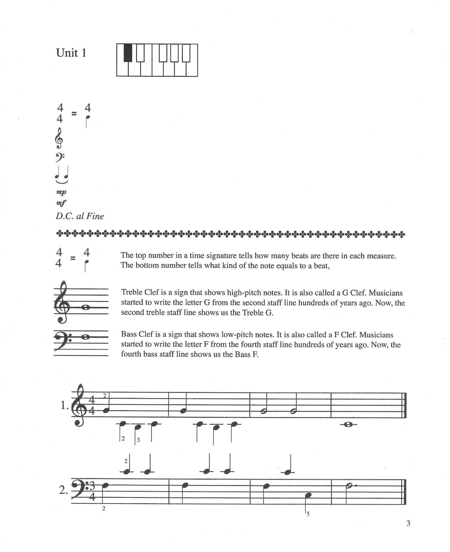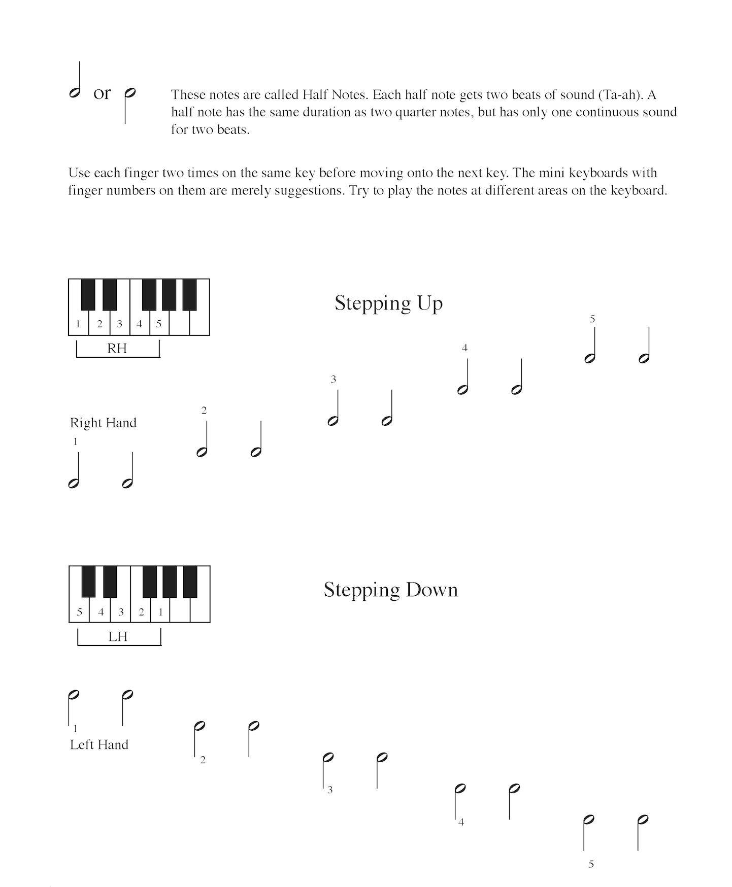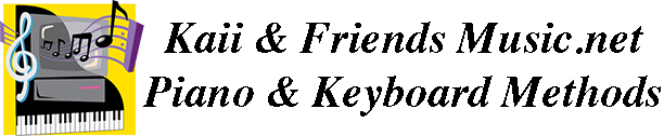 Kaii has created several piano and keyboard method books for her students. The following samples are taken from her books. Her method starts with the idea that students would learn directions of right and left, high and low, follow by durations of long and short, and sound and silence.
