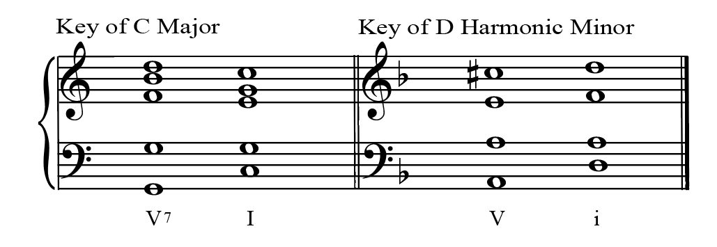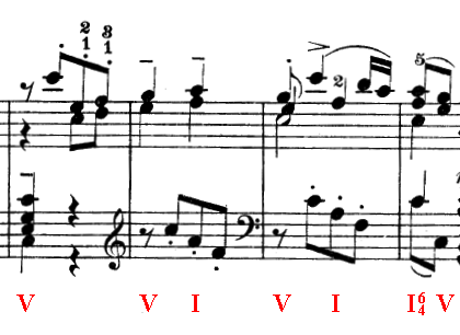 Music example of Half Cadence from JS Bach Italian Concerto First Movement, Measures 5-8