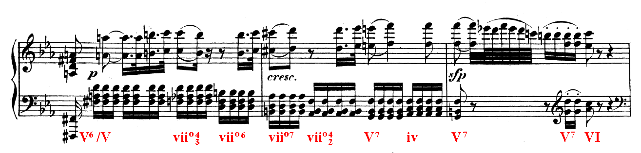 Music example of Deceptive Cadence from Beethoven Pathetique Sonata, Op.13, First Movement, Measures 7-9