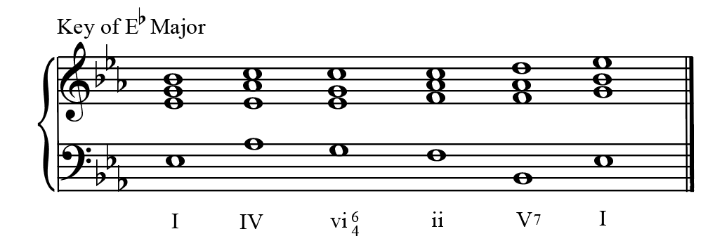 The next example shows the involvement of the Roman Numerals in a more advanced Chord Progression.
