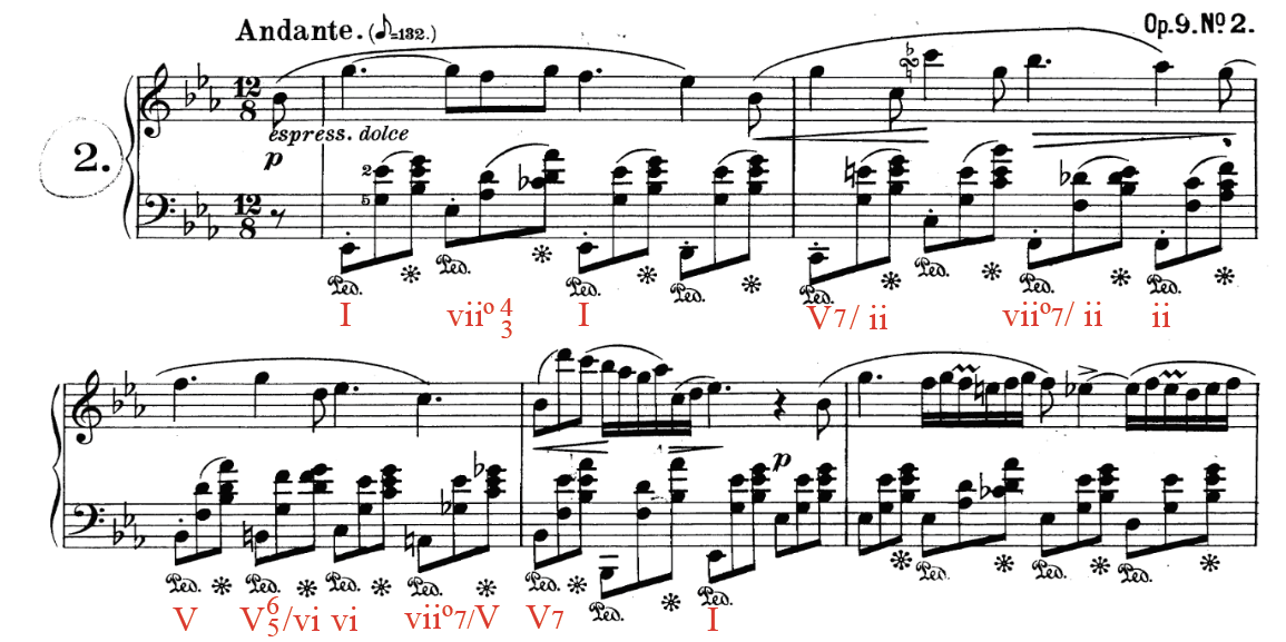 Here is a portion of the Chopin Nocturne, in the key of E flat major, Op. 9, No.2. The Chord Progression includes several Secondary Dominant chords.