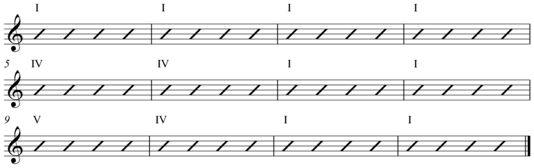 Blues is a style of music with its own specific Chord Progression. It is generally referred as the "12-Bar Blues." The Chord Progression is strictly following the "I–I–I–I, IV–IV–I–I, V–IV–I–I" format. For example, if the music is written in the key of G, the Chord Progression would be written as G–G–G–G, C–C–G–G, D–C–G–G. Here is an example of a 12-Bar Blues.