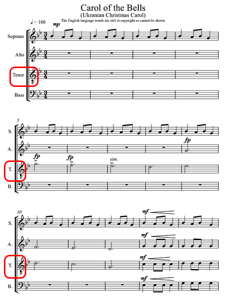 | Many choral music has Soprano, Alto, Tenor, and Bass individual parts written on separate staff lines. The Tenor Clef, instead of the former Tenor Clef that described above, is currently written as a Treble Clef with a number 8 right below it to show that is one octave lower than the regular Treble Clef. It is a new way of writing a specific Octave Sign. See the sample on the right. |