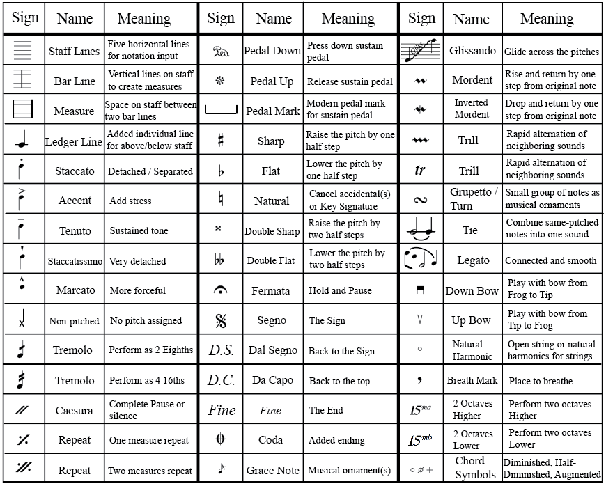 Notation | Time Signatures | Clefs | Articulation | Dynamics | Octave | Repeat Signs | Tempo | Chords
