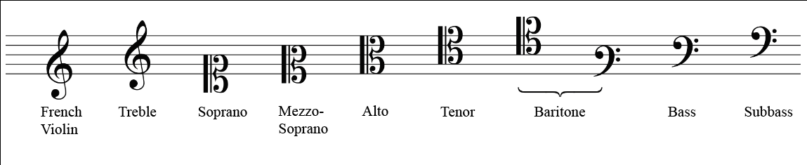 | *** Some choral scores still use the Soprano, Alto, Tenor, Baritone, and Bass clefs for those individual parts. All the other types of clefs are less commonly used now. With the exception of the drum staff, that doesn't indicate pitches. see the following graph. |
