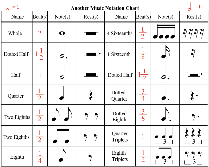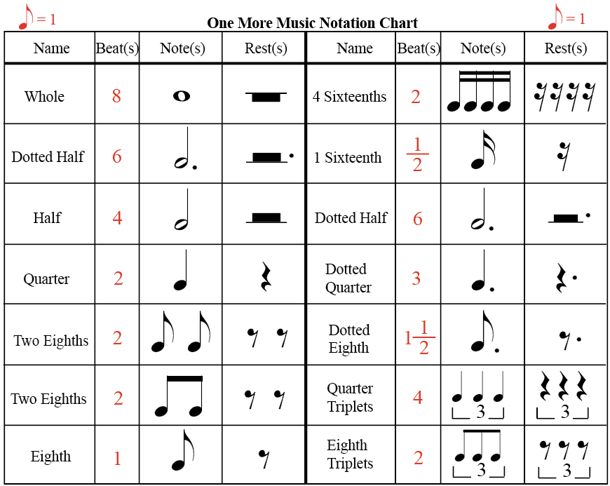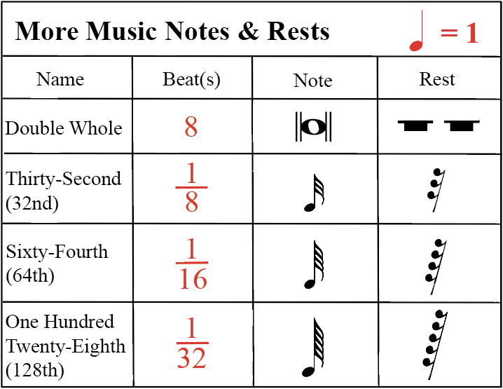 There many more different kinds of notes and rests. Some of them are listed on the following chart. Using quarter note as a standard one beat, the following notes and rests have the duration accordingly.