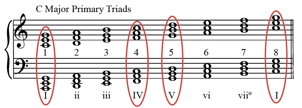 Each of these degrees in any scale has its own unique name and Roman Numeral that associates with a specific degree. The Primary Triads are built on the Tonic (I), Subdominant (IV), and Dominant (V) degrees. See the following chart for the scale Degree Names and Roman Numerals.