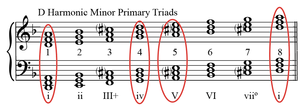 All the major, minor, diminished, and augmented chords/triads are divided into Primary Triads and Secondary Triads categories. This page is centered on the Primary Triads. A primary triad has to be built on degrees 1, 4, and 5 in any scale, or Tonic (I or i), Subdominant (IV or iv), and Dominant (V). The Roman Numerals are used to represent the degrees of these triads. All major and augmented triads will be presented by Upper Case Roman Numerals, while the minor and diminished triads will be presented by lower case Roman Numerals. See the C Major and D Harmonic Minor Primary triads below.