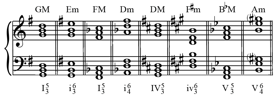 As the triads/chords being re-arranged, a different set of symbols will represent each chord position correctly with numbers that reflect the correct intervals within the rearranged chords. In the sample above, the Root Position has an interval of a fifth between the top and bottom note, while an interval of a third is presented between the lower two notes, hence the mark of 5 and 3. In the First Inversion sample, there is an interval of a sixth between the top and bottom note, while an interval of a third is presented between the lower two notes, hence the mark of 6 and 3. Finally, In the Second Inversion sample, there is also an interval of a sixth between the top and bottom note, while an interval of a fourth is presented between the lower two notes, hence the mark of 6 and 4. Here are several examples of the combinations of Roman numeral and inversion markings that represents different keys, primary chords, and inversions.