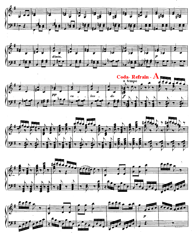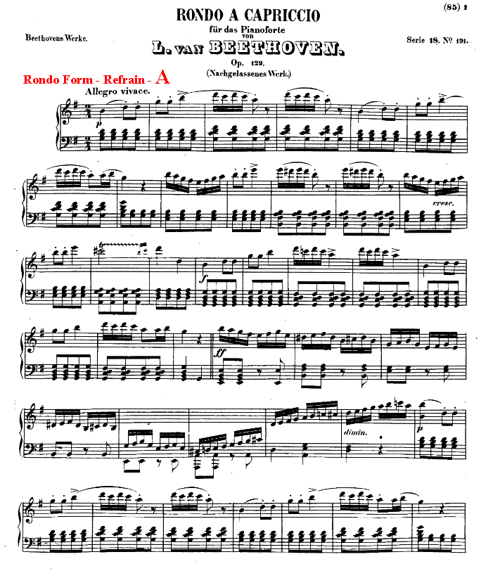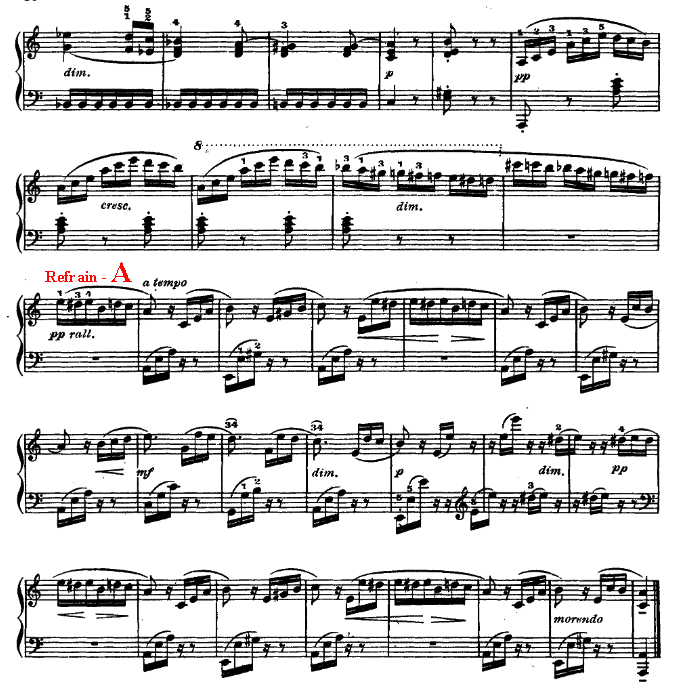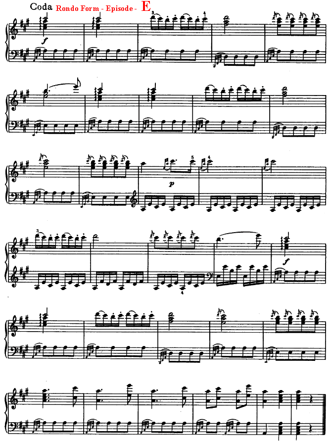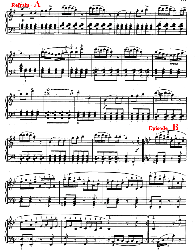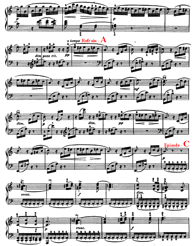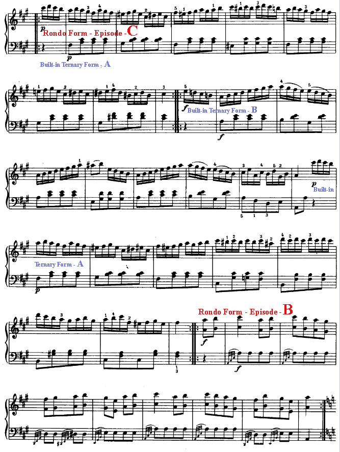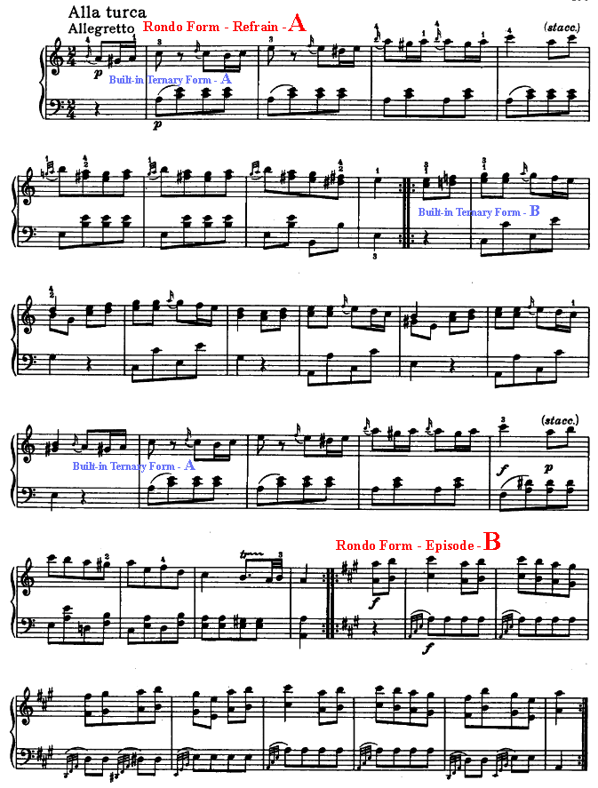 Another very famous Rondo, but different, written by Wolfgang Amadeus Mozart in seven sections, ABCBADE, with built-in Ternary (ABA) Forms in the two Refrains and Episode C. The following example is from Mozart's Piano Sonata No.11, Last Movement. It is called the "Turkish March."