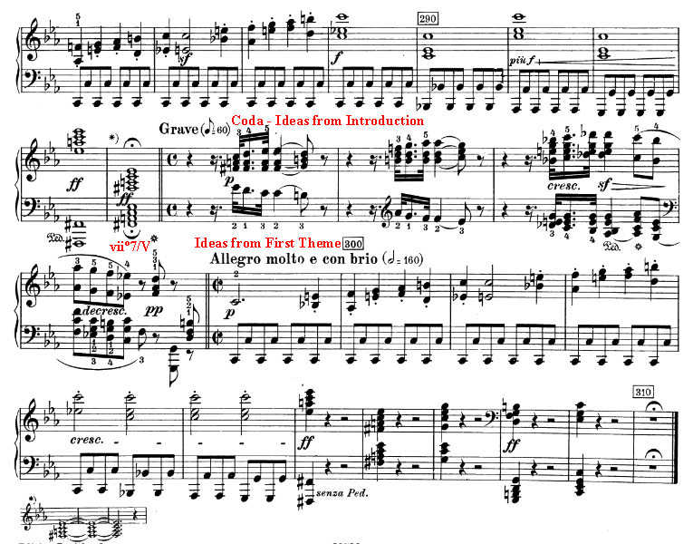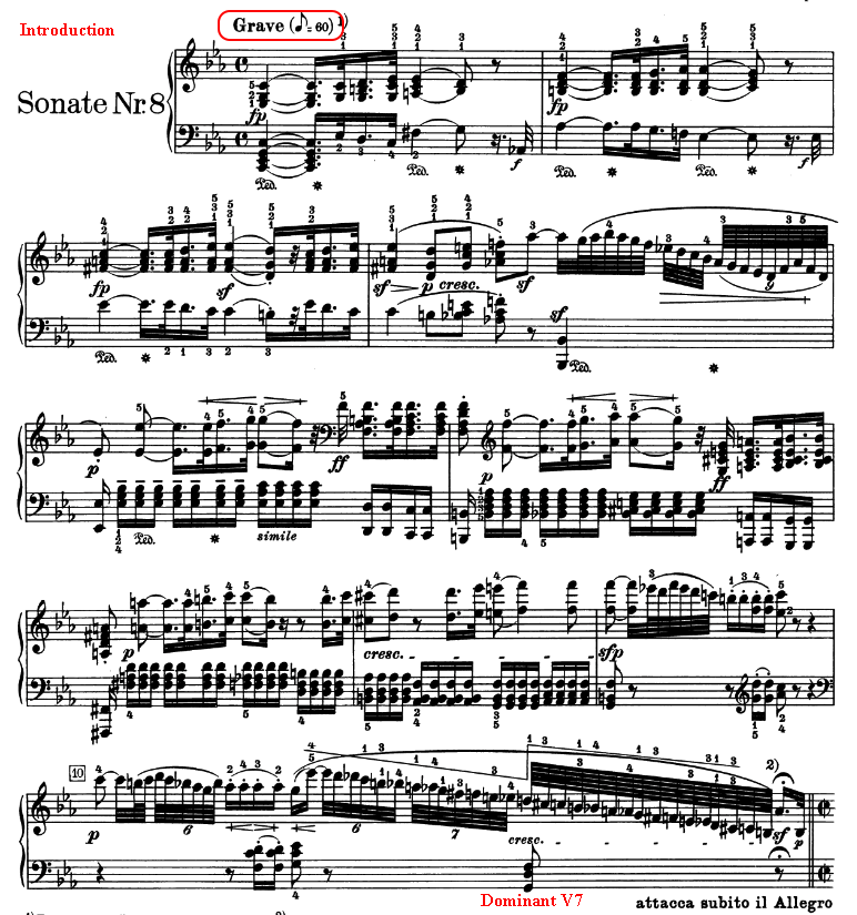 Sometimes the Sonata Form does not begin with a fast tempo as the Sonata-Allegro Form promised. It is due to an added section called Introduction. In this section, usually the music is slow and sometimes full of dotted rhythm to add more complexity to a Sonata Form. This section usually ends on a Dominant chord before the "Allegro" section begins. The sample here is taken from Ludwig Van Beethoven's Piano Sonata Pathétique, No.8, Op.13, in C Minor. The Allegro section would continue right after the Dominant 7th chord.