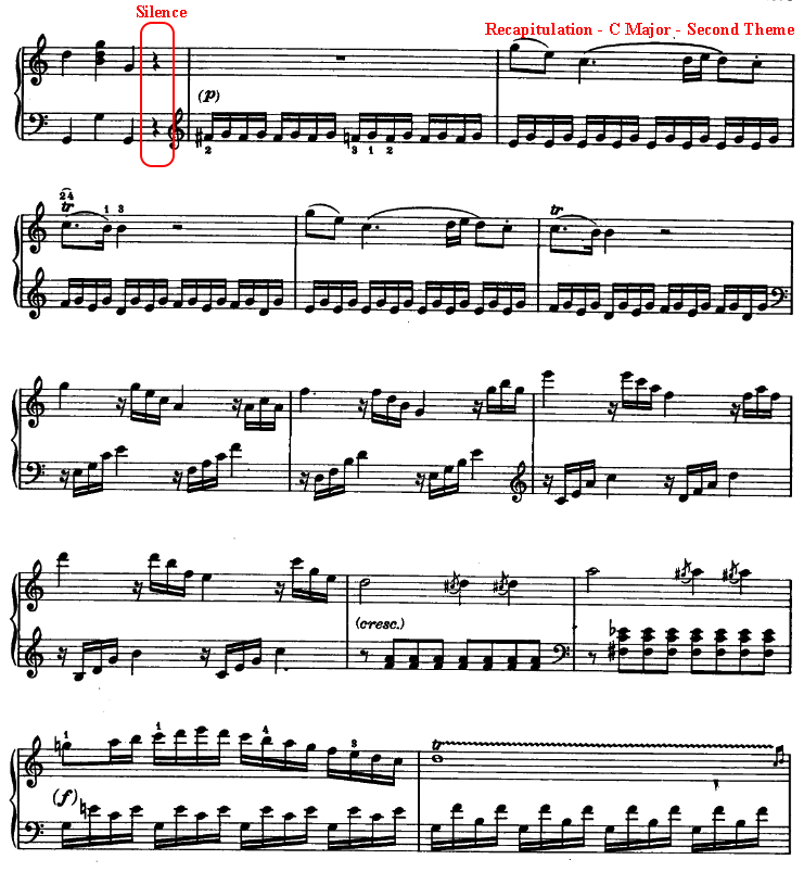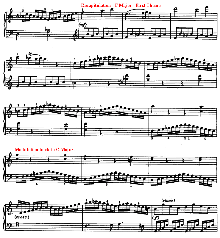 Generally, the Recapitulation is the section that composers would bring the music back to the original key; therefore, the Ternary (ABA) form. Surprisingly, some Recapitulations did not start with the original key. Mozart liked to play a joke musically in the next example. It is taken from his Piano Sonata, K.545. Instead of the original C Major, Mozart wrote F Major instead. However, by the second theme, everything worked out.