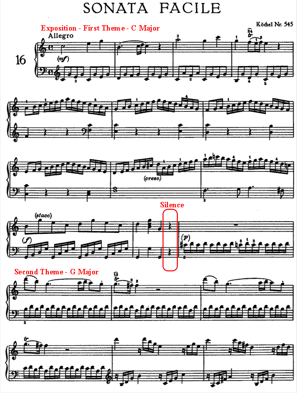 The Exposition in a Sonata Form introduce the main theme or melody. During the Classical Period, composers used a complete stop or silence to separate the first theme and the second theme. Usually by the second theme, this music had modulated into other keys, primarily the Dominant. As the music traveled through the Exposition, it settled in the Dominant chord.