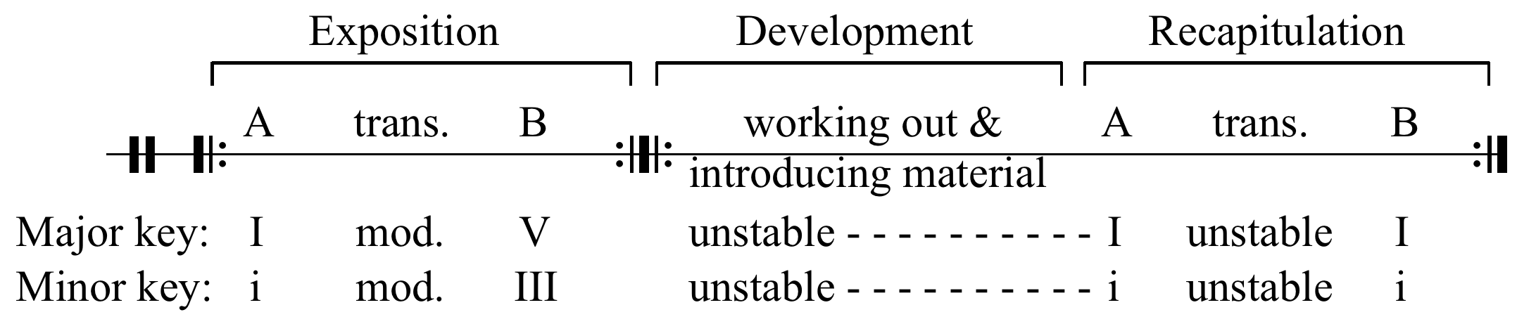 Throughout the Western music history, the Classical Time Period holds a very prominent position in music compositions. There are many ways to write music with different structures or forms. Sonata Form is, also called the Sonata-Allegro Form, a musical composition structure that usually consisting of three main sections: an Exposition, a Development, and a Recapitulation. It has been used widely since the middle of the 18th century. The standard components of Sonata Form focus on the thematic and harmonic ideas of tonal materials that are presented in the Exposition, more elaborated and contrasted ideas would be introduced in the Development, and finally all good musical ideas returned harmonically and thematically in the Recapitulation. Sometimes extra sections of Introduction and Coda could be added to a Sonata Form as well. Overall, the Sonata Form has a Ternary (ABA) structure. The Sonata Form is mostly used in the first movement of an instrumental composition, such as a Piano Sonata, Violin Sonata, a Concerto or a Symphony. The following graph demonstrates the sections of a Sonata Form that move from Exposition through Development to Recapitulation.
