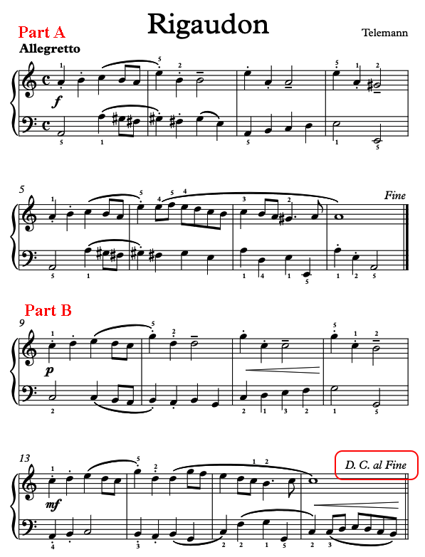Telemann's "Rigaudon" has three portions, even though it looks like two portions only. With the repeat sign at the end of the page, it made the song another 8 measures longer; therefore, an "ABA Form."