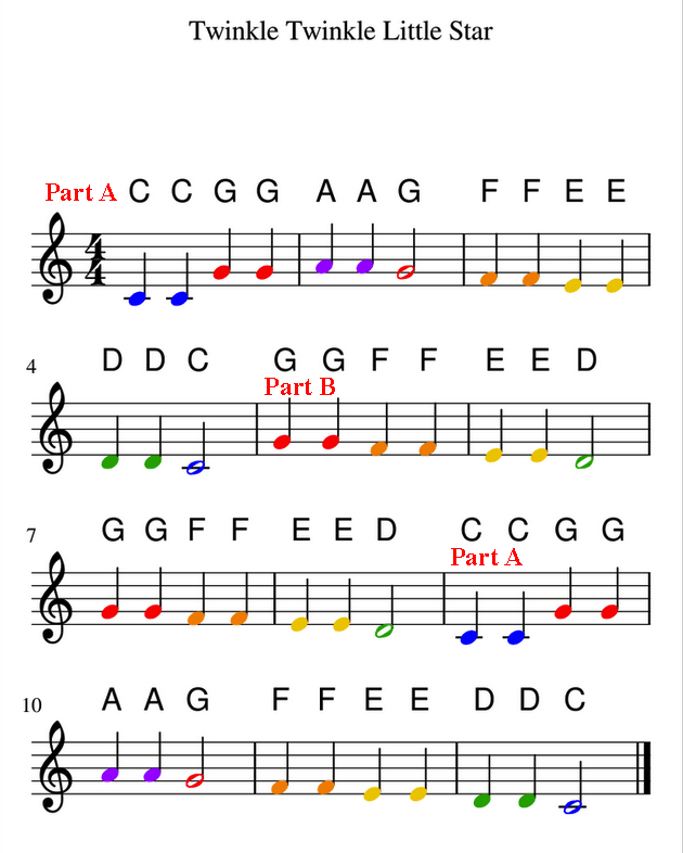 One of the most famous songs in the world is called "Twinkle, Twinkle, Little Star" in English. More song titles have been created by using this melody, such as "Baa, Baa, Black Sheep." This song has three portions. With the first (M.1-4) and last (M. 9-12) portions being identical, only the second (M.5-8) portion has a different melodic line but using the same rhythmic pattern. The color-coded notation helps to identify the notes and pitches.