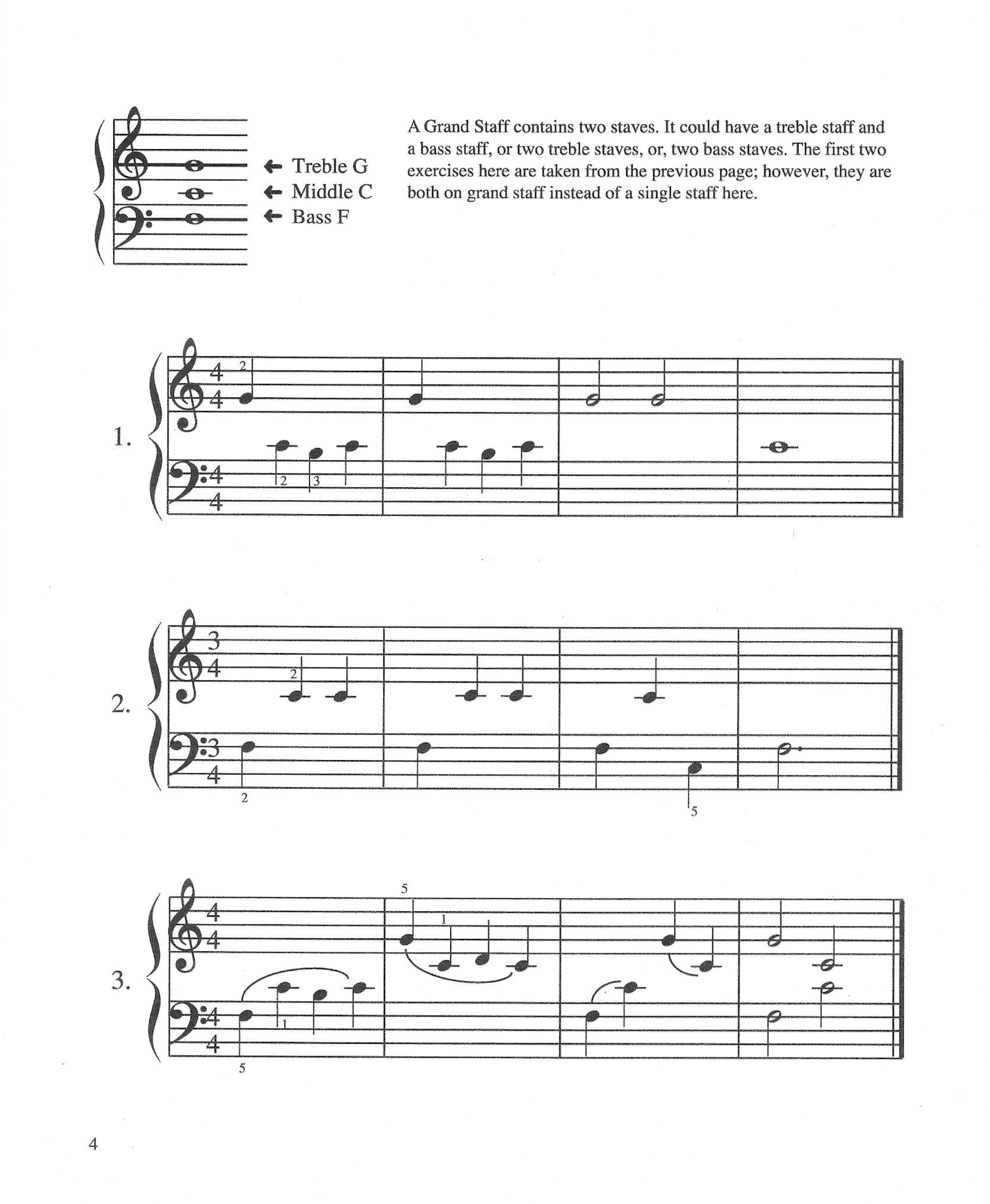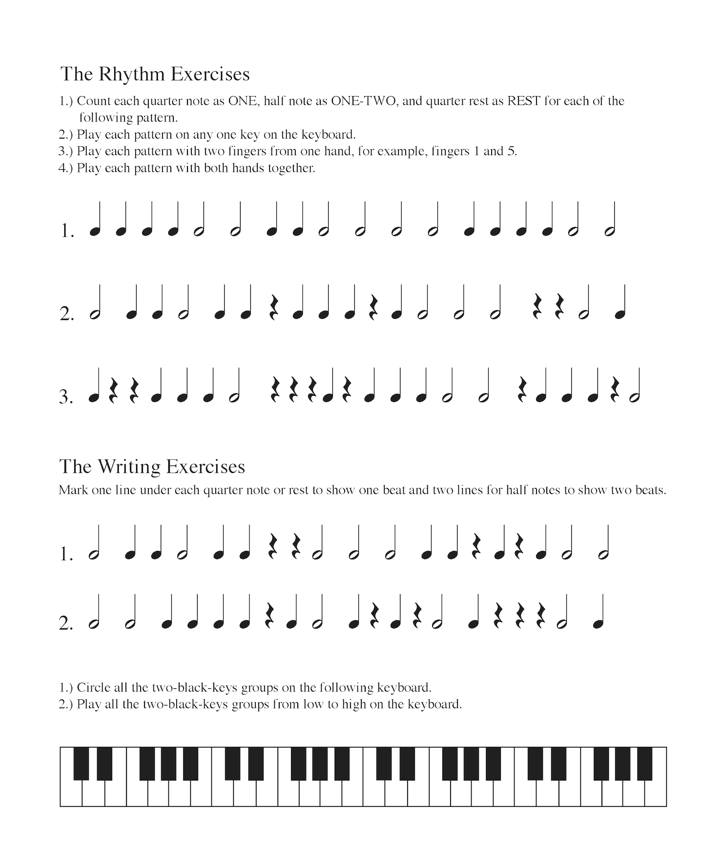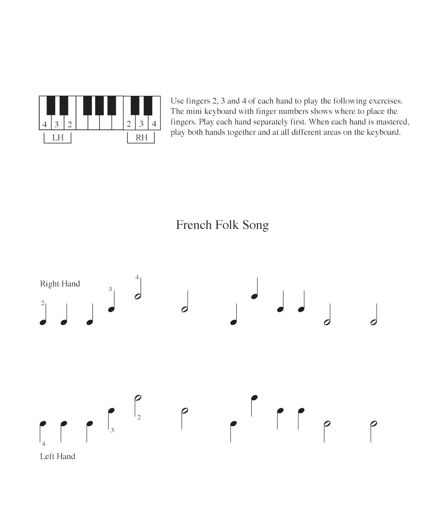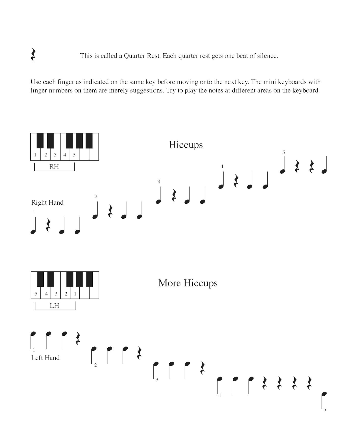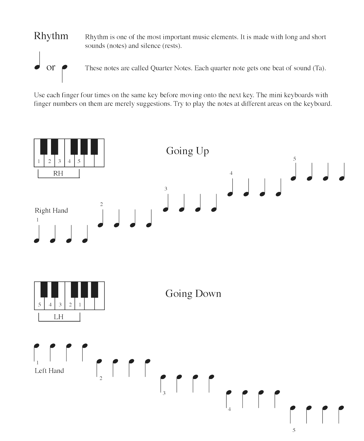 Kaii has created several piano and keyboard method books for her students. The following samples are taken from her books. Her method starts with the idea that students would learn directions of right and left, high and low, follow by durations of long and short, and sound and silence.