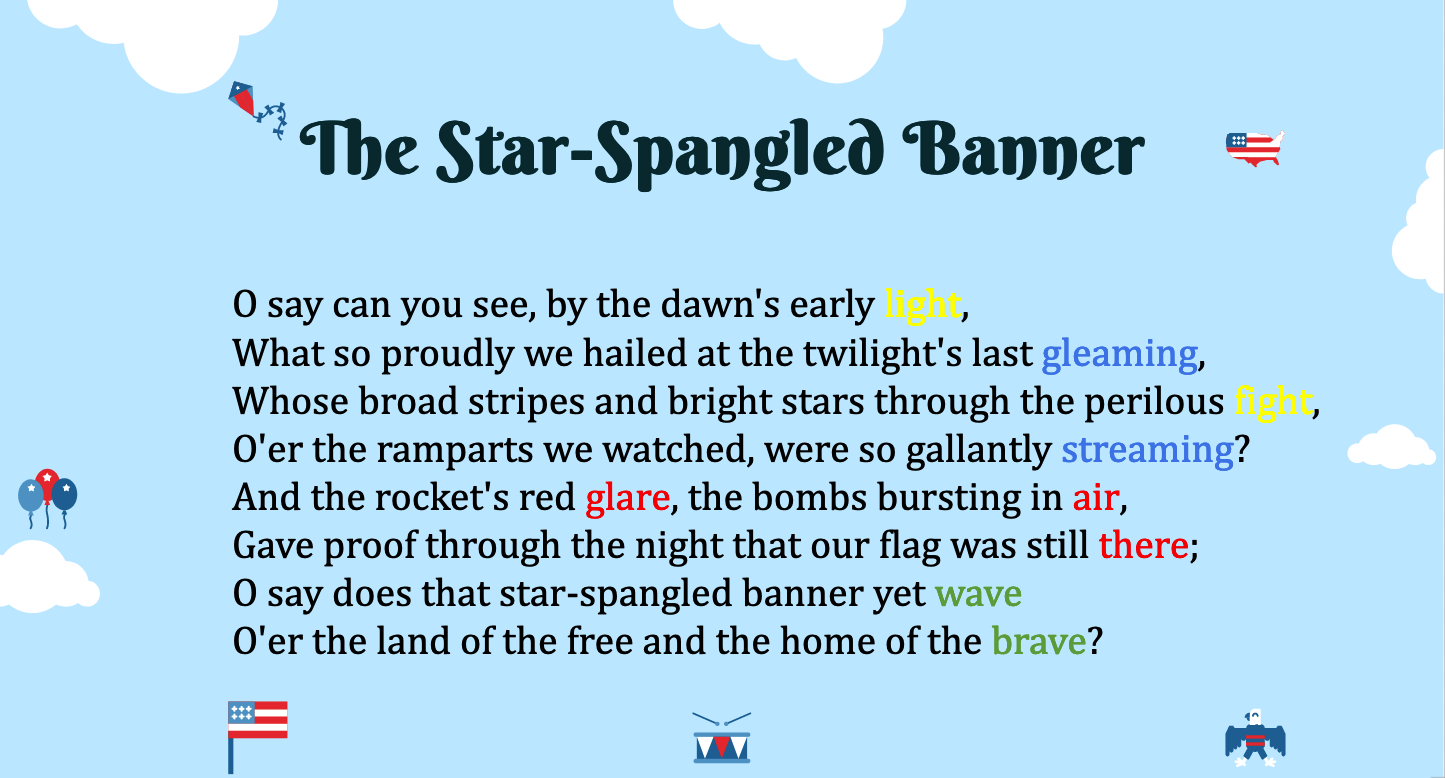 Ms. Lee will teach a lesson on the topic of "The Star-Spangled Banner" and get your own copy of the lyrics here.